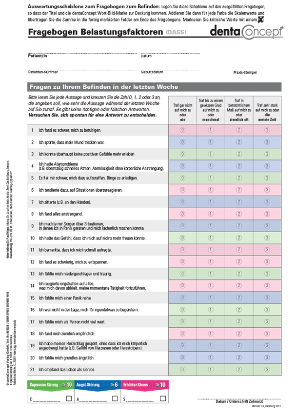 Mit der deutschen Version des DASS (Depression, Anxiety and Stress Scale, Lovibond et al.)  nach Nilges, Korb und Essau, der auch im Deutschen Schmerzfragebogen der Deutschen Schmerzgesellschaft e.V. seit 2012 eingesetzt wird,  können die drei  Dimension „Stress, Depression und Angst"  mit nur 21 Fragen erfasst werden. Eine leichte Auswertbarkeit und Angabe von Cut-off-points ermöglicht eine unkomplizierte erste Einschätzung (dentaconcept / dgss).  Der Patient muss in jedem Fall darüber informiert sein, weshalb ein solcher  Fragebogen mit für die zahnmedizinische Diagnostik teils eher ungewöhnlichen Fragen zum Einsatz kommt. Ein gutes Zahnarzt-Patienten-Verhältnis sollte daher gewährleistet sein.